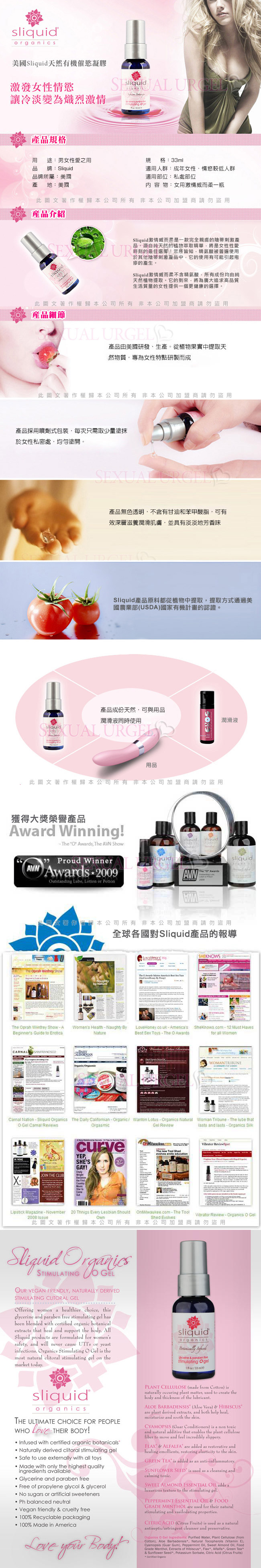 Sliquid女性情趣提升凝膠,100%純天然成分。由天然配料,薄荷油、甜杏仁油等製成。不僅能夠充分滋潤您的私密部位,而且會給您帶來慾火焚燒的性愛激情效果,趕快來試試吧!