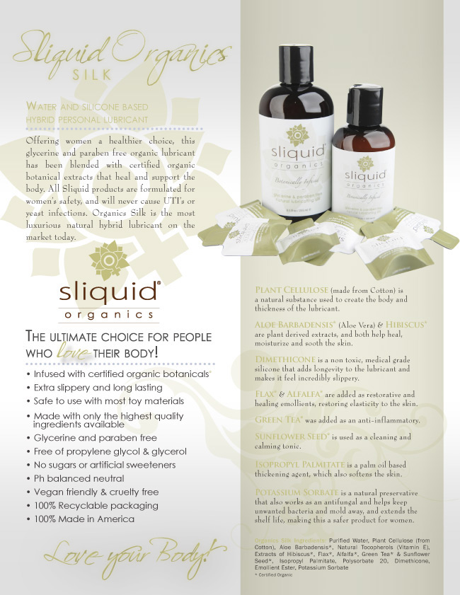 美國Sliquid 人體潤滑液,世界上唯一完全不含甘油及防腐劑的私密處潤滑產品,所有Sliquid產品均採用安全配方,以保護女性安全為生產宗旨。我們的目標是為了女性生產安全天然的人體潤滑液以及其它能夠提高性欲快感的密處秘產品。