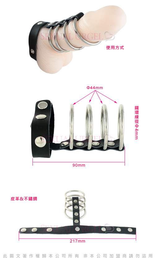 本品由不銹鋼與皮革製作,由四隻陽具環組成,並以皮革扣帶相連,使用時可將四隻陽具環依次套在勃起的陽具上,增加男性性感與功能。