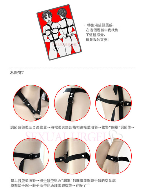 綁縛给一些人帶来安全感和歸屬感。但綁縛需有很高的技巧,喜歡簡單點的玩友選擇成套約束衣是非常恰當的。