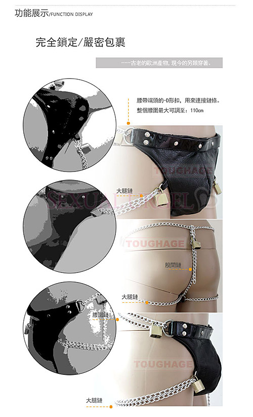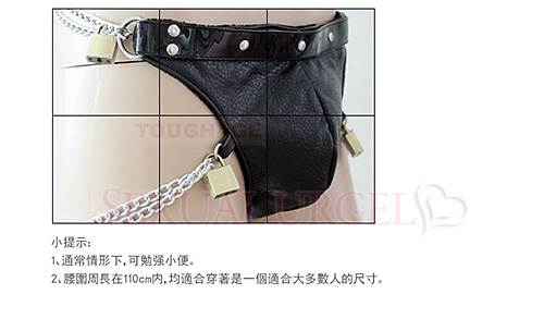 穿上並鎖起來! 這是一條性感的男士内褲,優質.PU皮革縫製,腰間鑲有一條鏡面皮革, 内襯毛巾绒,吸汗且透氣,利於長時間穿著。 特别的設計是:腰圍、胯下及大腿部設置金屬鏈條,並配置4把合金掛鎖。利用鏈條和鎖, 可以牢固的將男性器官嚴密包裹。此外,由於胯下及大腿部僅有鏈條圍繞,因此整個屁股 是完全顯露的,帶來性感和有趣的感覺。 功能方面我們已經提到,它可將男性器官嚴密包裹起來,没有鑰匙打開掛鎖,整條内褲是 無法脱下的。因此,您可以想到:用它來鎖住您的愛人後,他便無法進行性交。