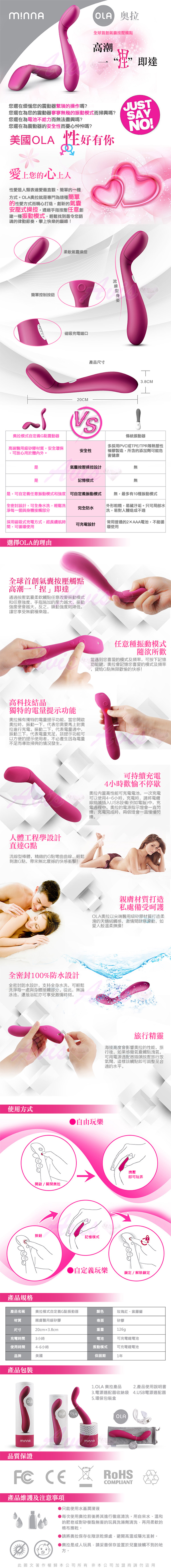 .主商品:美國minna-OLA奧拉 全球首創氣壓式操控可記憶振動模式G點防水充電按摩棒(桃紅)