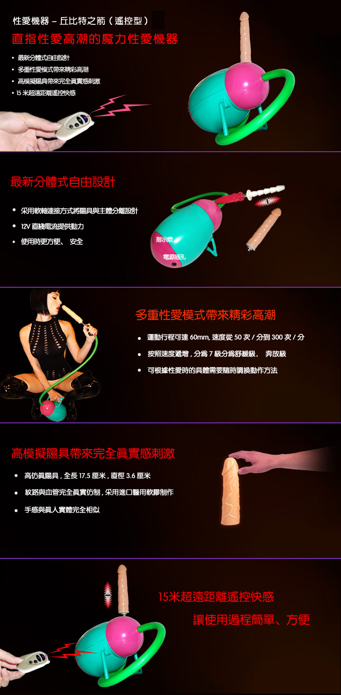 使用時不受空間的限制,可以在車內、室內等環境下使用。 丘比特運動行程可達60mm,動作速度從50次/每分鍾到300次/分鍾,按照速度遞增分爲7級,動作方法多樣,仿真程度極高,分爲舒緩級、奔放級,可根據女性性愛時的具體需要隨時調換動作方法