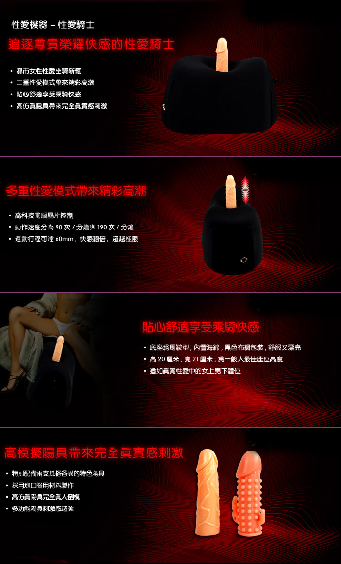 1、騎士是中世紀高貴血統與英雄的代名詞,作為全新時代的激情騎士,從乘騎具有科技感的性愛機器中體驗到淋漓盡致的高潮快感,同樣會讓人體驗尊貴與榮耀。這款性愛騎士特別針對處於生活主流層級的現代女性定制,190次/分的超爽速度結合無級變速的抽插快感,堪稱讓都市女性坐擁騎士尊寵的終極高潮製造機。