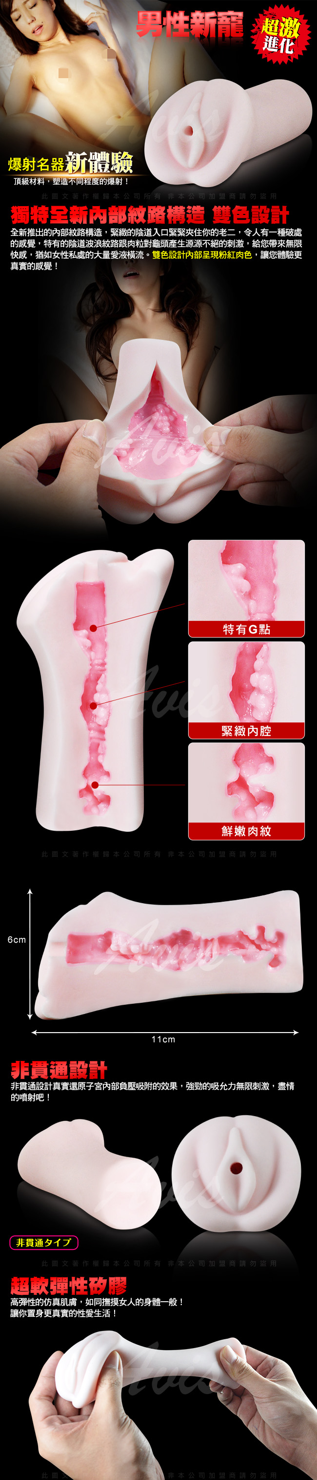 輕輕的拿起名器時,手感真是相當紮實且柔軟,摸起來就像是直接觸摸到女人的肌膚那樣的真實,而內部精緻的紋理,還原了女人內部的複雜構造,複雜型管道 ,每一步都是一個新的刺激點,真實內陰的誘惑導引,男人們就像被吸住一樣的欲罷不能