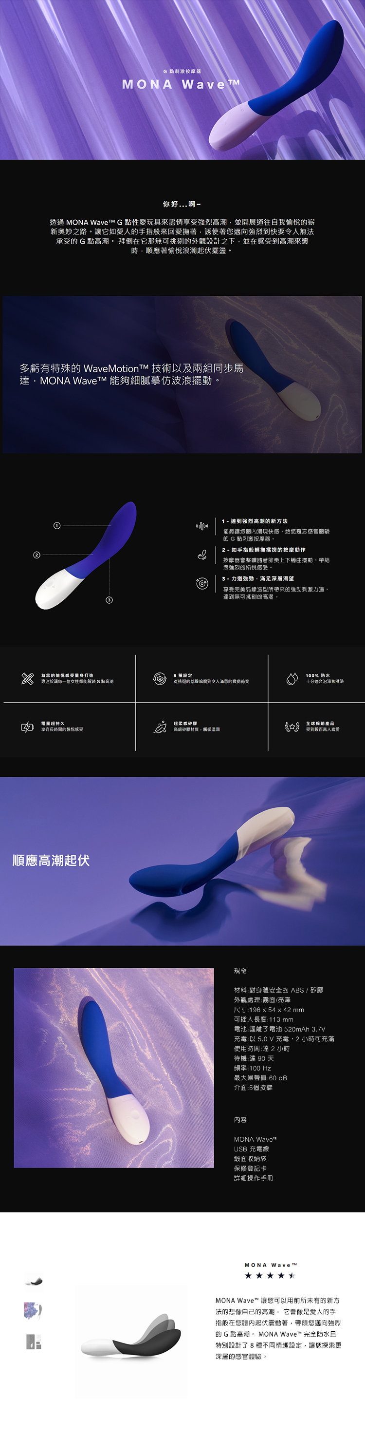 跟隨這款世界首款真正在體內按摩的G點按摩器,臣服於陣陣的強烈高潮之中吧! MONA Wave造型性感,模仿手指伸直彎曲的動作,不僅給予您無極限的情趣,還將帶您跨越巔峰進入愉悅全新世界。 MONA Wave線條流暢,100%矽膠設計,可重複充電並完全防水,10種振動模式令您愛不釋手,想要更多。