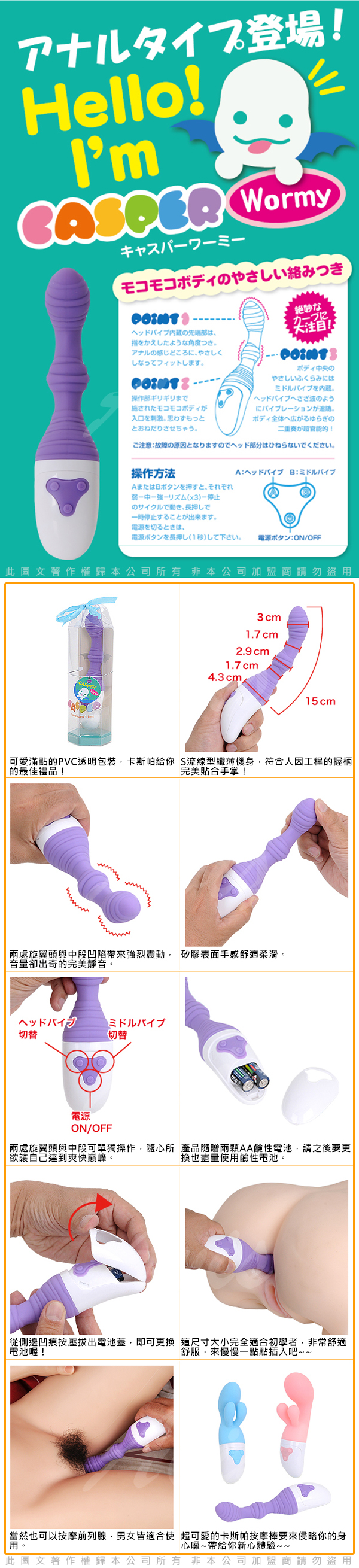 .商品名稱:日本RENDS CASPER Wormy 可愛變形蟲 前後兩用 G點按摩棒x1