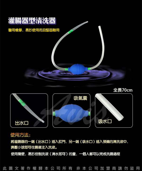.一端放入清洗液的容器,另一端插入後庭,擠壓小球即可往腸道注入洗液