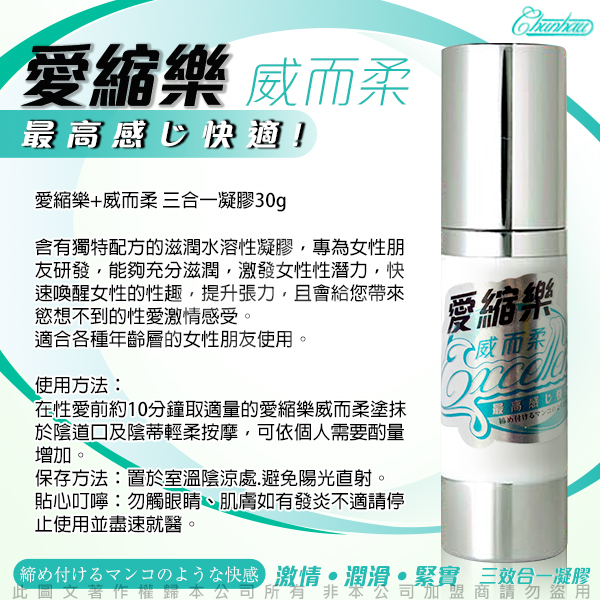 在性愛前約10分鐘取適量的愛縮樂威而柔塗抹於陰道口及陰蒂輕柔按摩,可依個人需要酌量增加。
