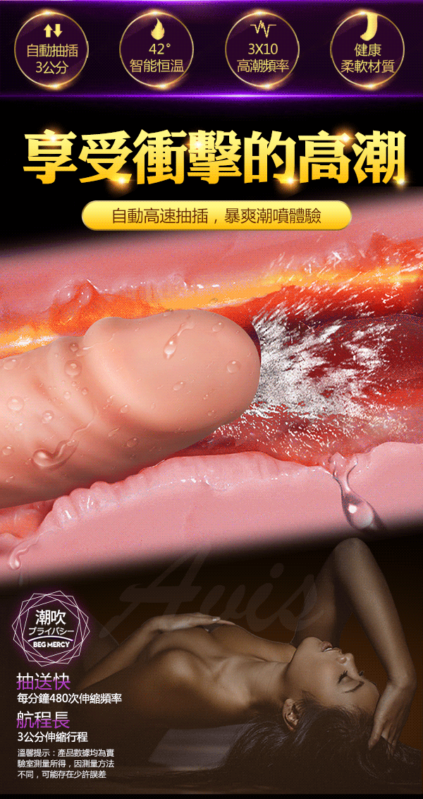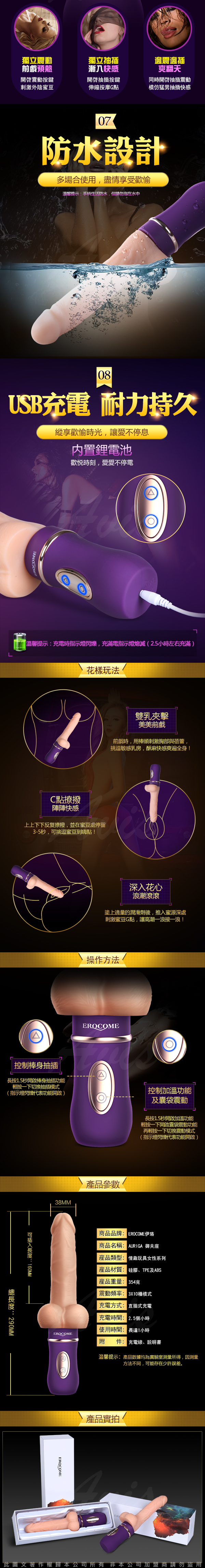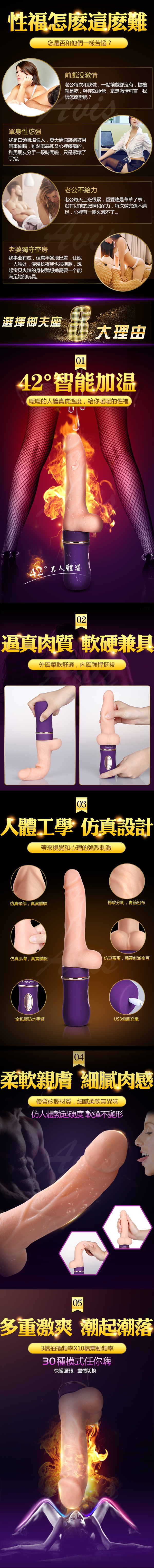 AURIGA御夫座 42°快速加溫,智能溫控 仿真設計體驗更真實,自動高速抽插棒解放雙手給你暖暖的性福,還原愛愛的真實體驗強勁馬達多頻震動享受激情。 3*10段加溫變頻陰道陰蒂雙重高潮,讓春水如浪潮湧出。柔軟矽膠無異味。全身防水,安心衛生。讓女人的高潮一擊爆發,事後直接用清水沖洗即可!做女人盡情享受!