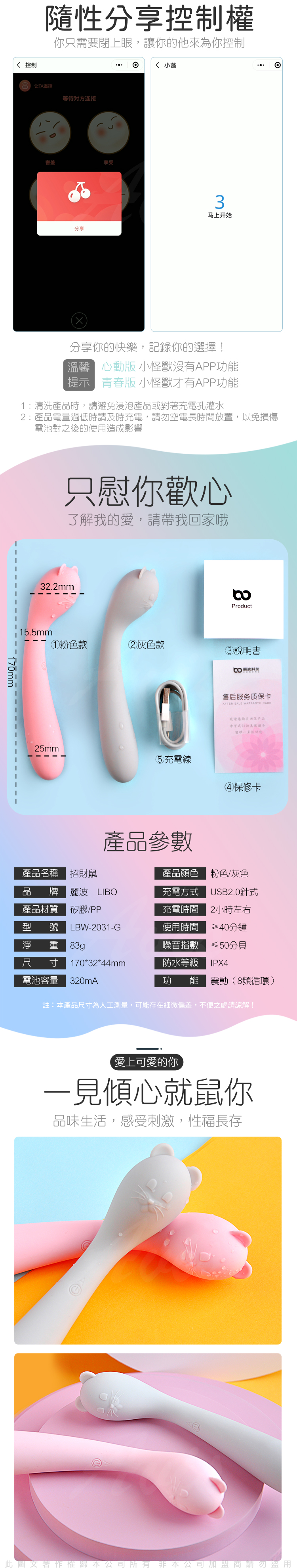.商品名稱:LIBO-招財鼠 8段變頻防水柔軟G點按摩棒 傾心版-粉色