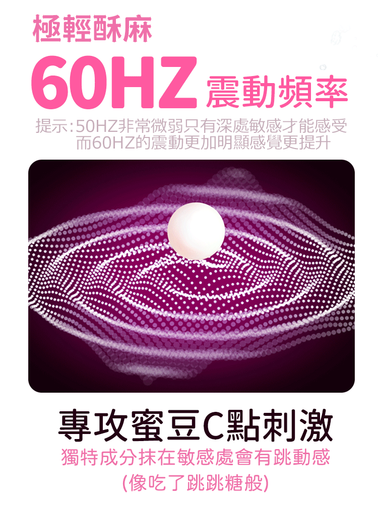 具有獨特震動感,類似跳跳糖帶給您跳動感覺,有助於女性自身分泌潤滑液。