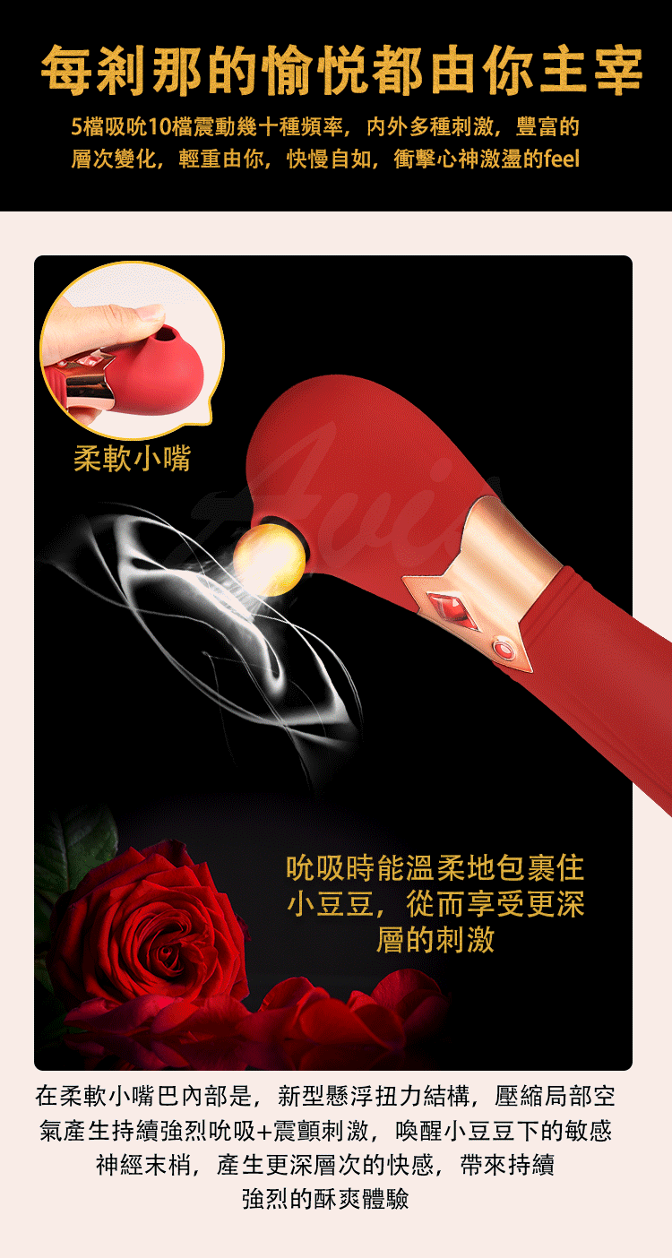如果你想要通過刺激陰蒂體驗潮吹的神仙感覺,S4女王是你最好的選擇,她能滿足你們所有對潮吹的想像。和市面上所有吸震玩具一樣,它也是一款通過吮吸和震動來刺激陰蒂引爆高潮的玩具。但是S4女王是一款經過改良後能超越他們的神器。全身非常柔軟,內置5種吮吸10種震動強度,自主選擇吮吸力度大小,能由外至內地傳遞震顫快感,讓你能夠達到高潮至潮吹快感。