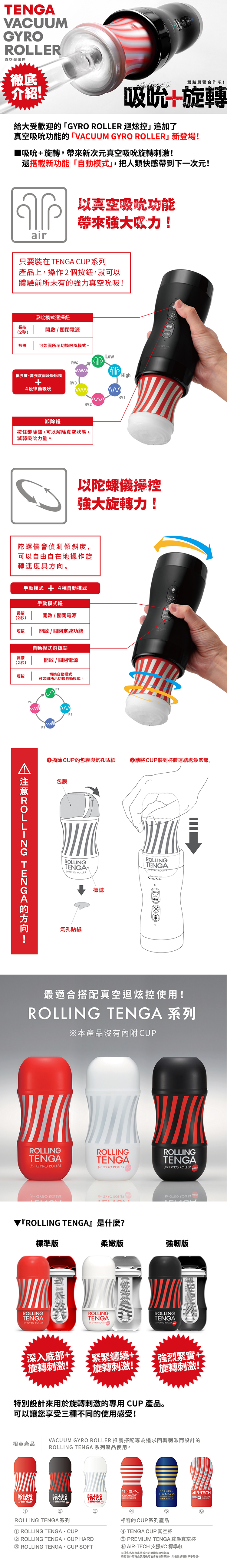 「TENGA VACUUM GYRO ROLLER 真空迴炫控 」結合兩種功能,讓您享受新次元的TENGA體驗「電動真空吸吮旋轉刺激」。