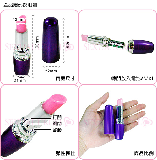 今天用粉紅色的明快的唇膏來引誘男朋友。轉動唇膏突然震動,這是什麼呀!!就是它,唇膏型小型玩物!就象真的唇膏一樣,轉動本體就會強烈震動。震動非常強,就象發動機一樣地震動。先端又是尖的,對於像陰蒂等小的部分可以很方便地刺激。而且從外觀上來看,即使時常放在化妝包裡,也不會讓人覺得奇怪,外出辦事很方便。