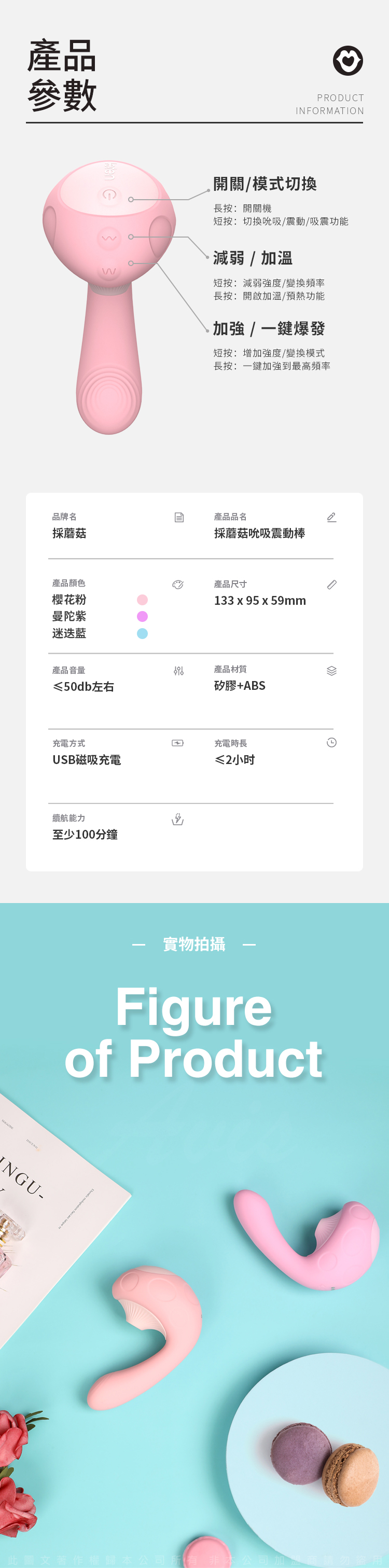 採蘑菇吮吸震動棒,撞上蘑菇雙頭設計多維刺激C/G點,帶來更大的高潮。魔力雙擊蜜豆G點同時爽,強吸+深震,帶來內外全面高潮。模擬口腔真空緊緊吸,爽到腿無力。吸震同時配合30種模式,多維刺激變幻花式快感。