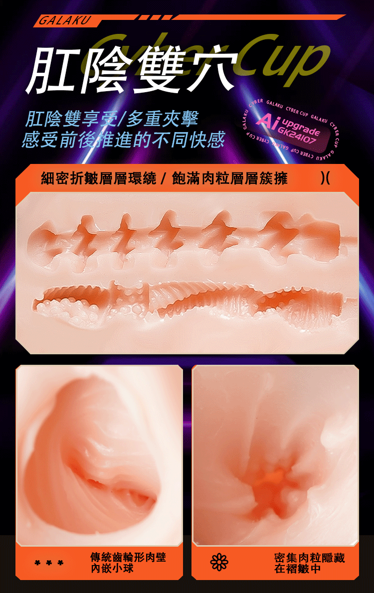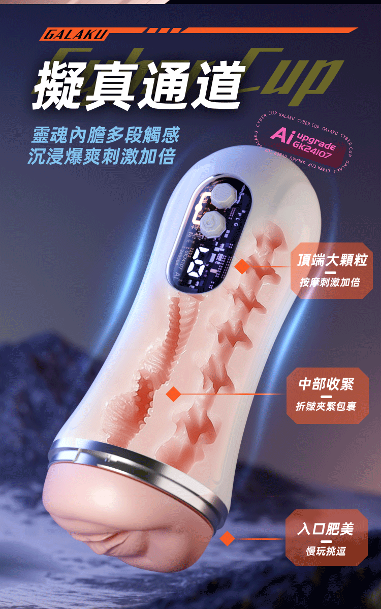 GALAKU 賽博朋克電動飛機杯電動AI版,結合前衛科技與智慧功能,讓您體驗超乎想像的4D刺激。搭載智慧APP,配有智慧數顯功能,讓您隨時掌握使用數據,享受更智慧的使用體驗。這款飛機杯以雙穴設計及4D肉感,提供雙倍的真實感受,帶來沉浸式享受。升級晶片加強了整體性能,為您帶來流暢、精準的震動和吸力控制,使每次體驗都能如真如幻。