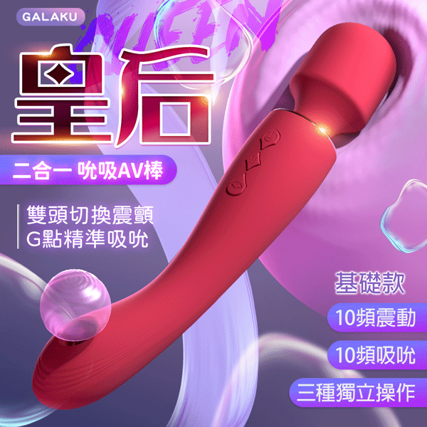 GALAKU 皇后AV按摩棒完美結合吸吮與震動功能,雙頭切換隨心所欲。一端是高效震顫的AV按摩棒,另一端則是精準吸吮的G點神器,讓你一次擁有雙重滿足,輕鬆探索不同層次的快感。